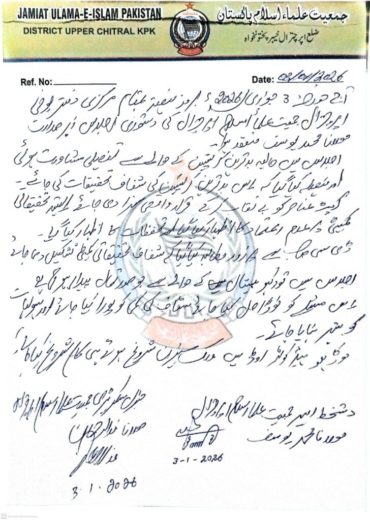 بونی (پریس ریلیز)آج مورخہ 3 جنوری 2026 بروز ہفتہ بمقام مرکزی دفتر جمعیت علمأ اسلام اپر چترال کی مجلس عاملہ کا اجلاس امیر مولانا محمد یوسف کی زیر صدارت منعقد ہوا۔ اجلاس میں حالیہ میڈیا پر زیرگردش بدترین کرپشن کے حوالے سے مشاورت ہوئی اور متفقہ طور پر قرارداد منظور کی گئی کہ اس کرپشن کی شفاف انکوائری کی جائے اور ملوث افراد کو بے نقاب کرکے قرار واقعی سزا دی جائے۔جو انکوائری کمیٹی بنائی گئی ہے اس پر بھی شدید تحفظات کا اظہار کیا گیا اور مطالبہ کیا گیا کہ دوبارہ غیر جانبدار کمیٹی تشکیل دی جائے۔تورکہو ہسپتال کا مسئلہ فوری حل کیا جائے، سٹاف کی کمی کو پورا کیا جائے اور تمام سہولیات فراہم کی جائیں۔موڑکہو ہیڈ کوارٹر روڈ پر ورک سیزن شروع ہوتے ہی کام شروع کیا جائے۔